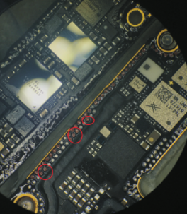 The ground lines are no need to fill, we just need to fill these 6 useful pins, we can check it under the Stereo Zoom Microscope. These all are the signal line of the NFC chip, so when we restore iPhone by iTunes, it reports unknown error 56.