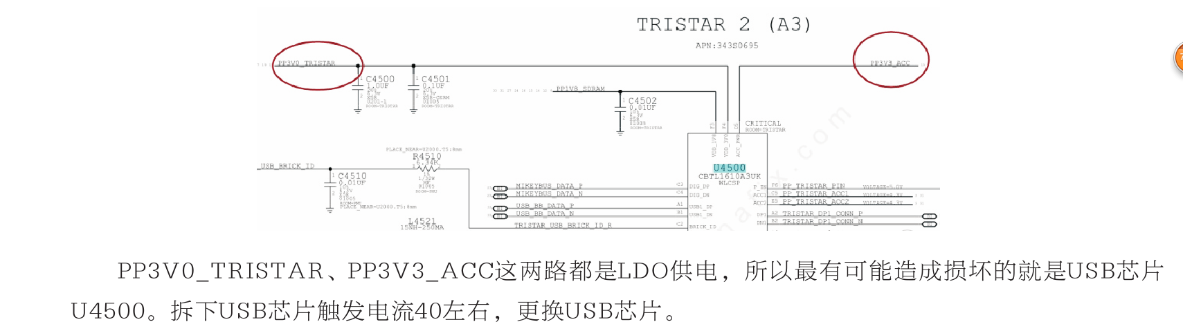 PP3V0_TRISTAR, PP3V3_ACC this two are supplied by all LDO power supply, so the most likely damage is the USB U4500 IC. Remove the USB IC with QUICK 861DW Hot Rework Station, trigger current about 40mA, then replace the USB IC.